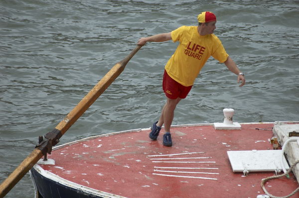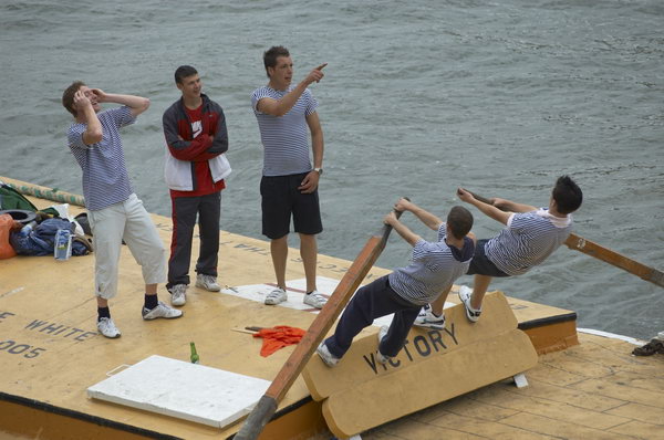 The leading team in the barge race. Rowers use their weight on the oars, with 2 pairs taking turns. |