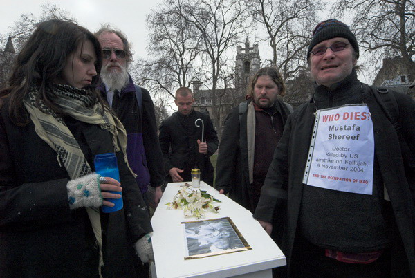 Naming the Dead: 2 Years After FallujahParliament Square, London 2 April, 2006![]() Maya Evans was the first person to be convicted of taking part in an unauthorized demonstration under the SOCRA Act in London |
