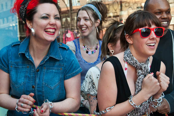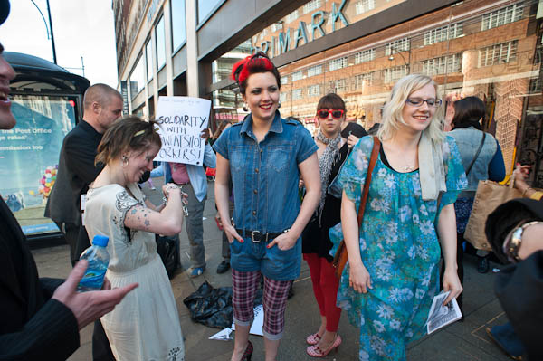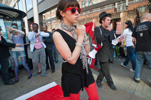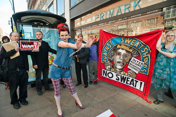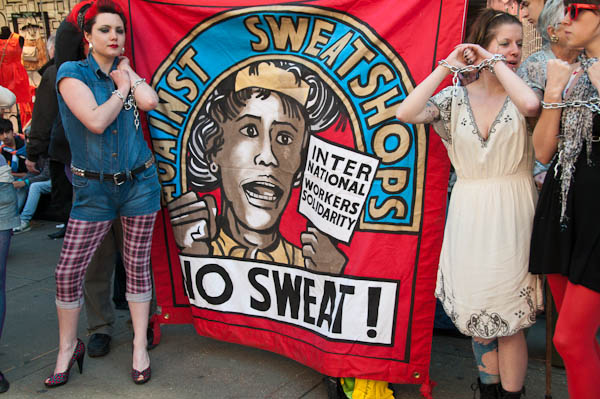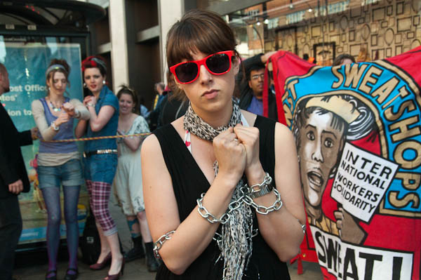 As the models paraded, shoppers were told of workers in Bangladesh being paid 7p an hour and working 80 hour weeks