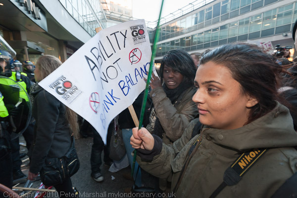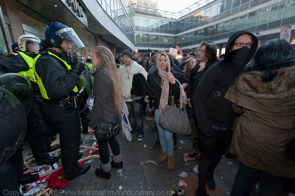 a stick from a placard is thrown towards the police - it bounces off the raised riot shield