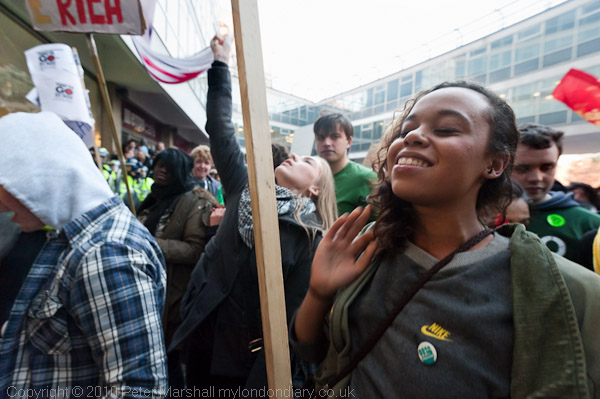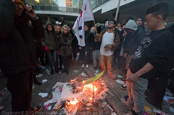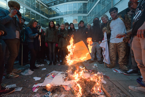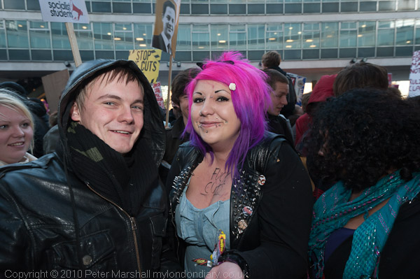 Graffiti on the wall, 'Tory Scum' and two students pose in front of the poster 'Don't Kill the Arts.
