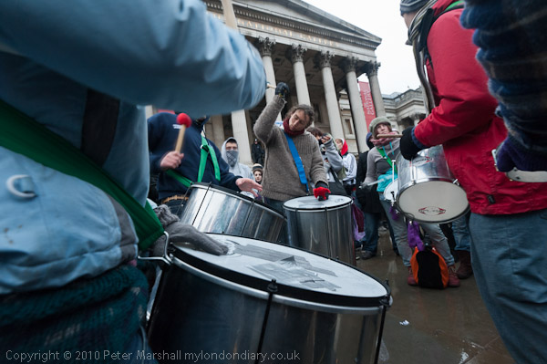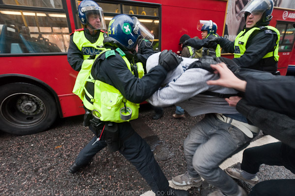 Back at Trafalgar Square, there is a good line of police across Whitehall, but people are walking through unchallenged