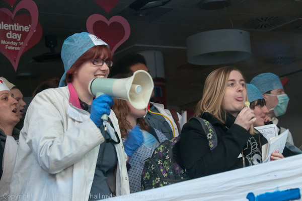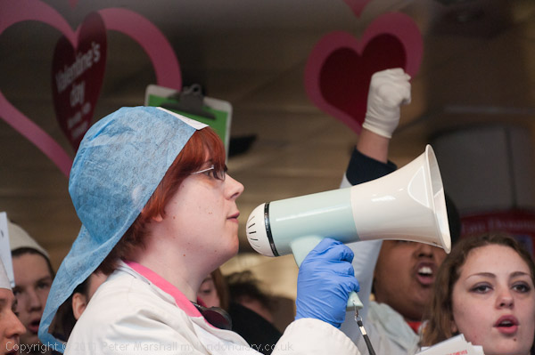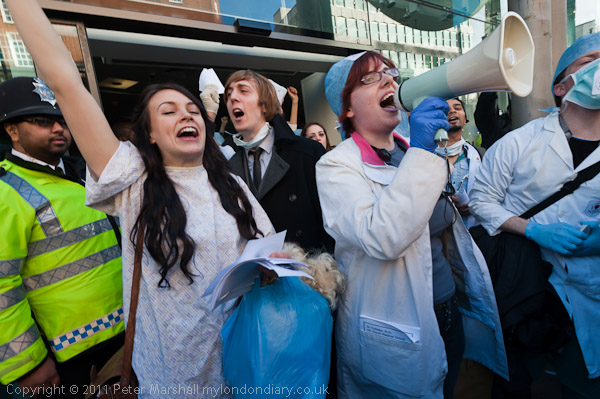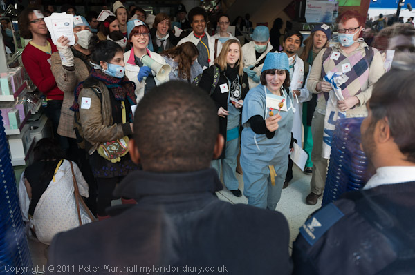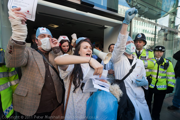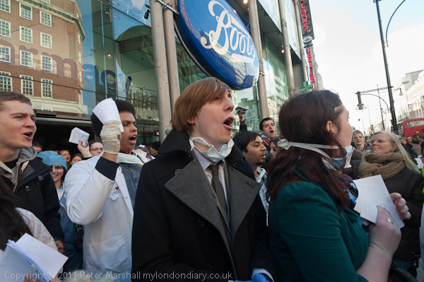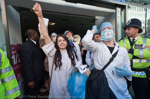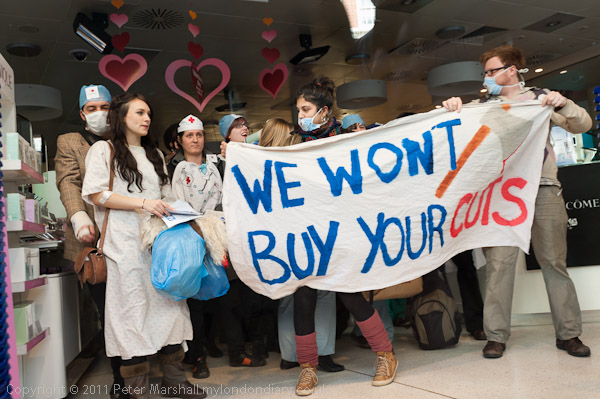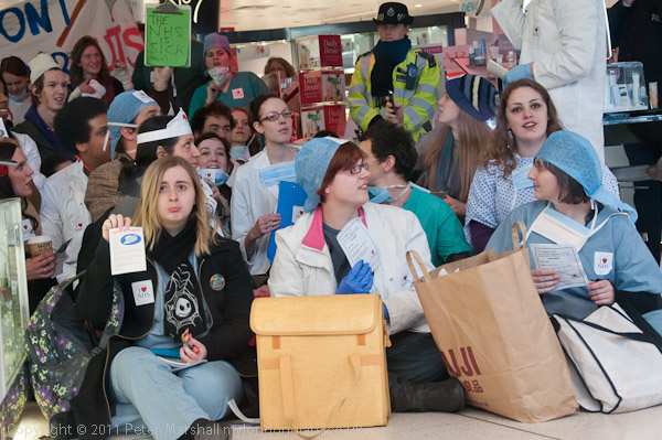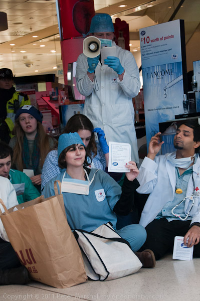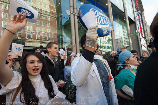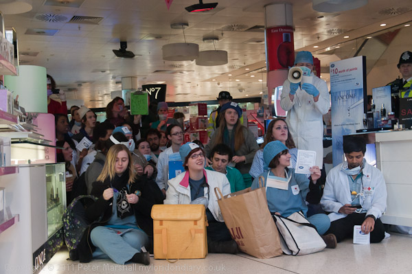 After occupying Boots for half an hour the protesters moved to the door of Boots, but the shop security locked the door - so they sat down in the shop