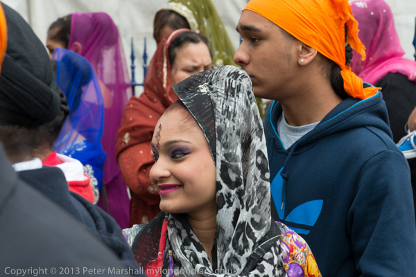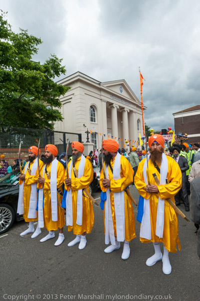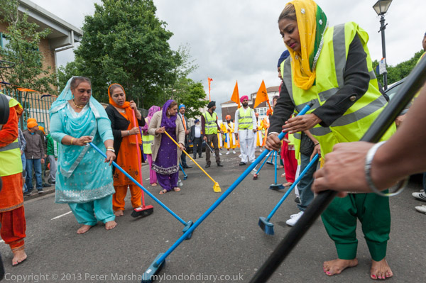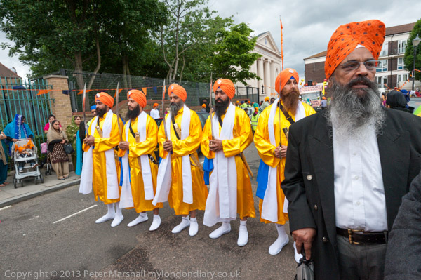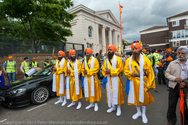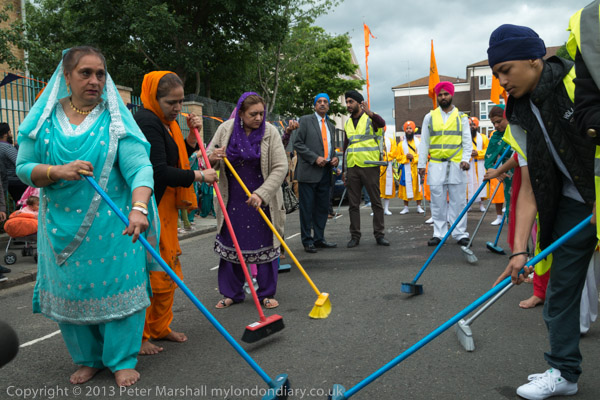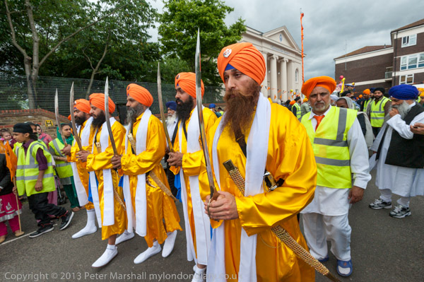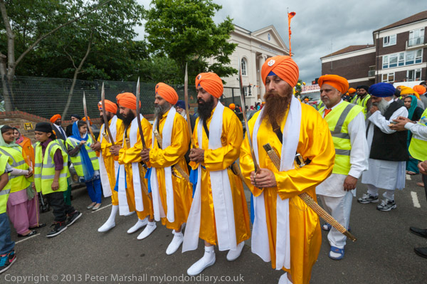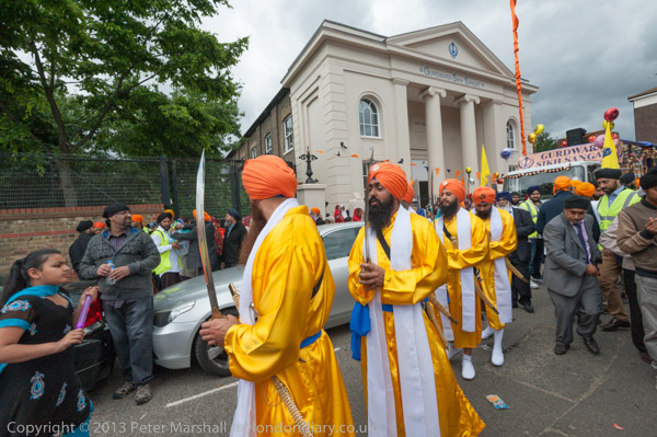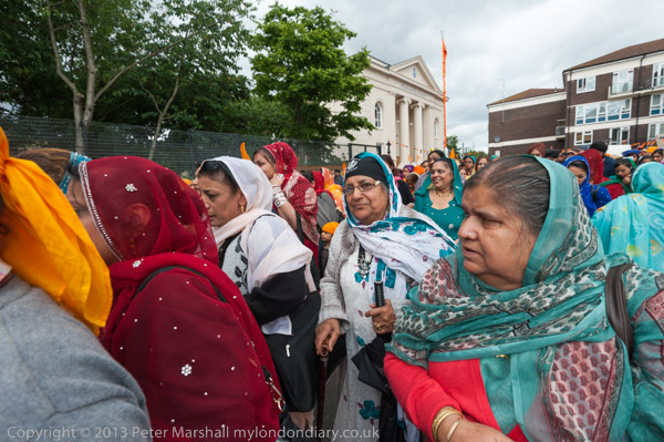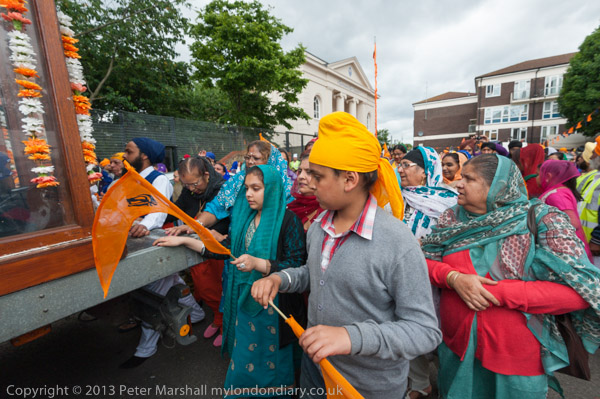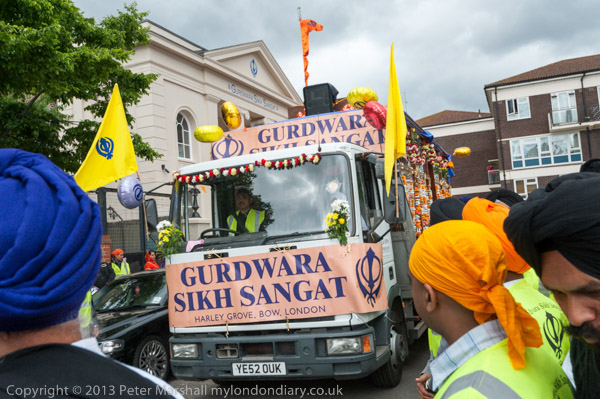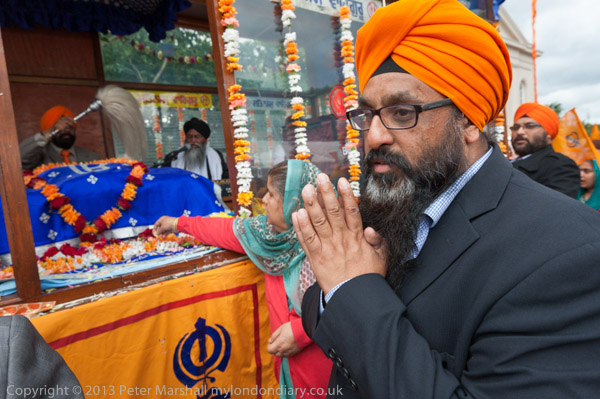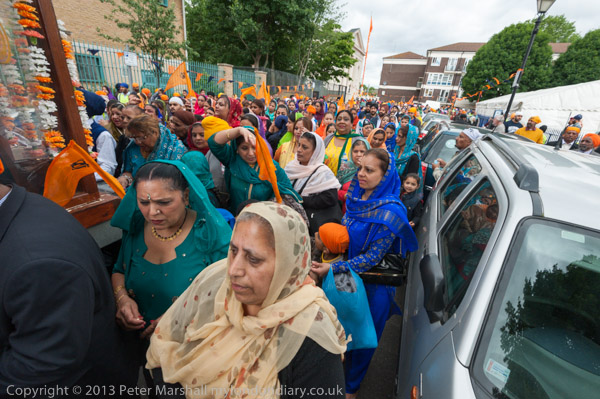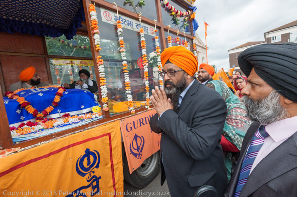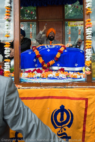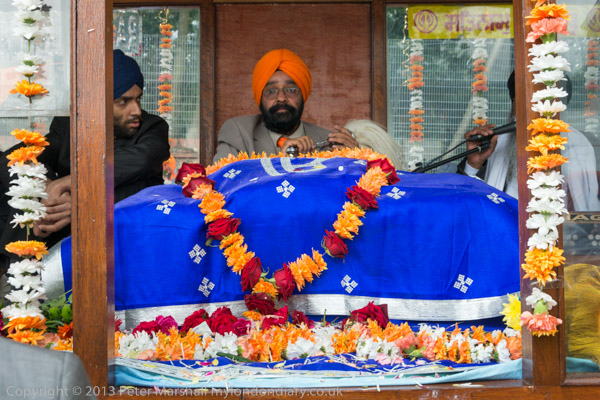 The congregation (Sangat) walk behind the float which houses the Guru Granth Sahib