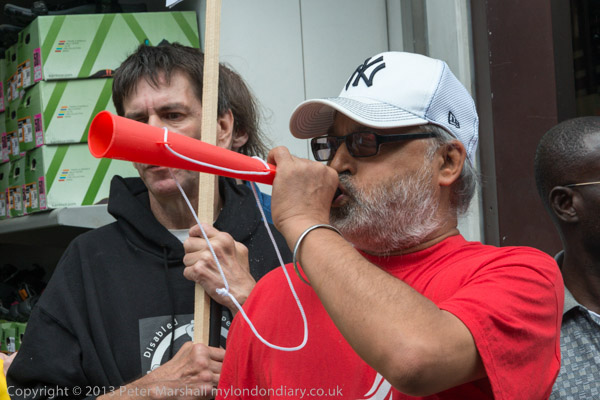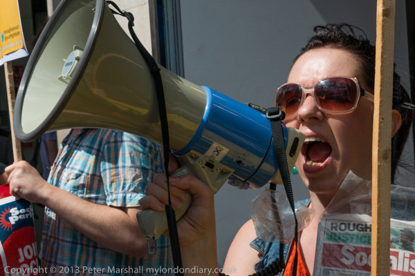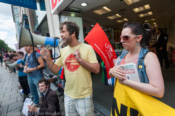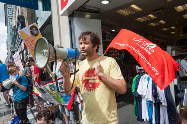 A man wearing a Unite t-shirt speaks thorugh a Socialist Party megaphone