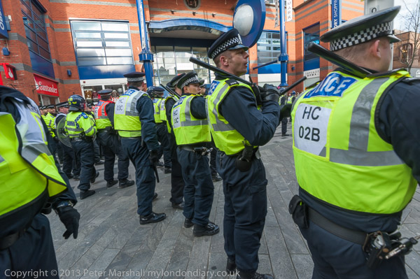 Police show their batons to a crowd of mainly local youths who have been pushed away by horses and riot police