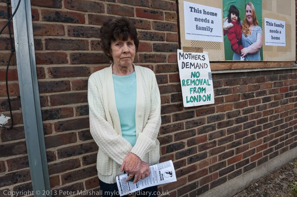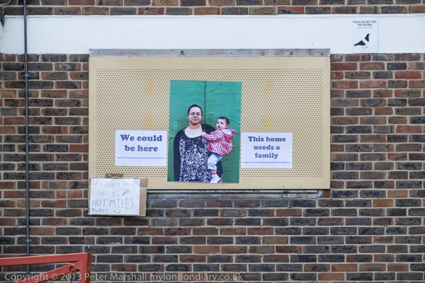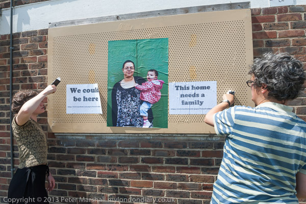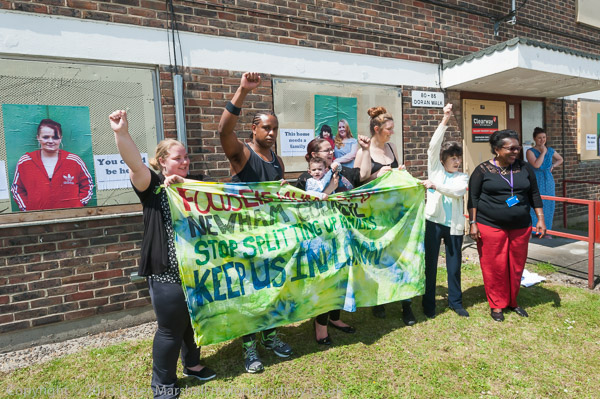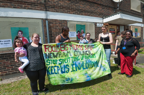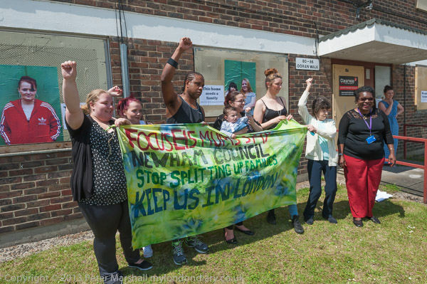People pose with the banner 'Focus E15 Mums Say Newham Council Stop Splitting up Families Keep us in London
