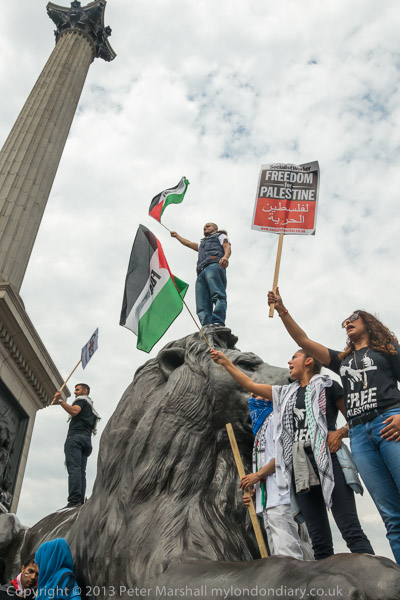 Some of the marchers stop to protest from the plinth of Nelson's Column and on the lions