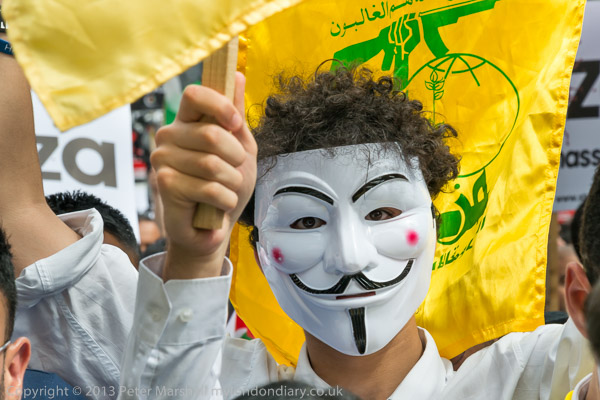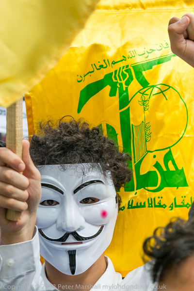 The small group of Anonymous protesters with Hezbollah flags in the crowd