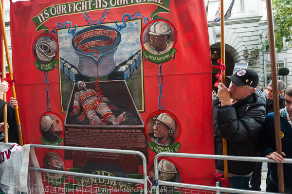 A NUM member holds the North Selby Miners banner at Orgreave Truth and Justice Campaign protest outside the