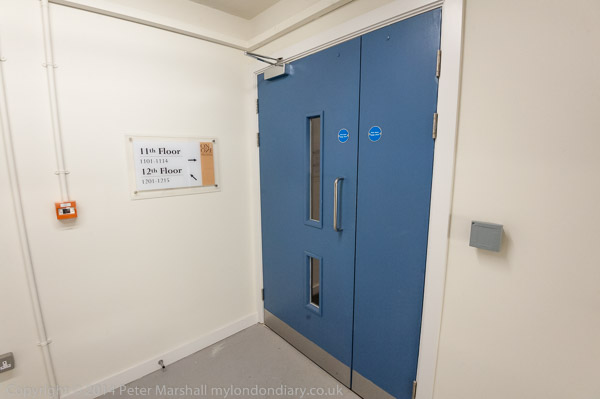 We go down the emergency stairs, but find the door to the poor side is locked - we have to go to the ground floor