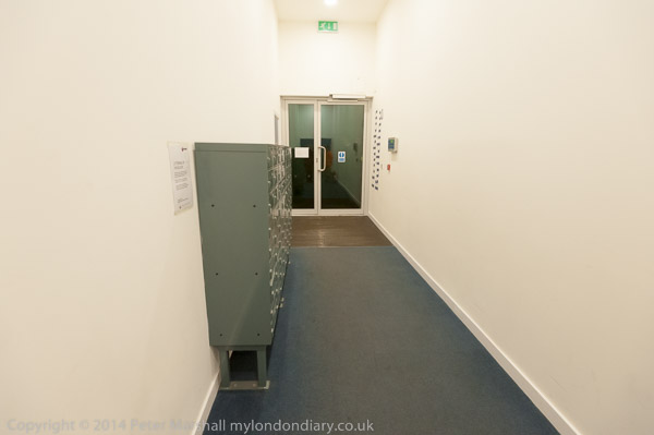 and a very bare looking group of post lockers leads to a small door at the end of a long corridor
