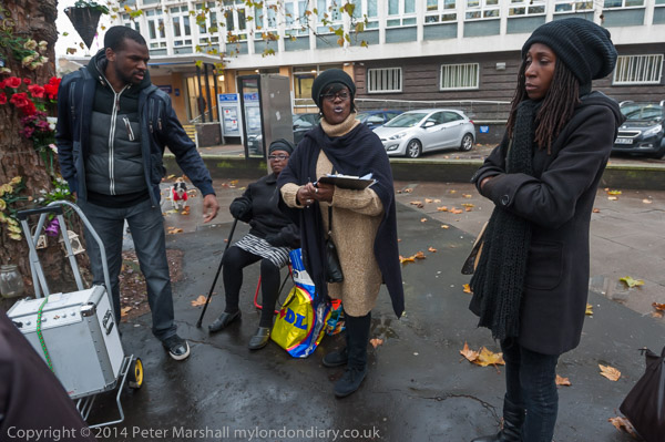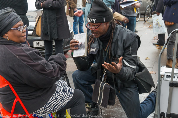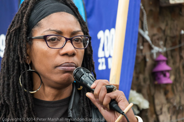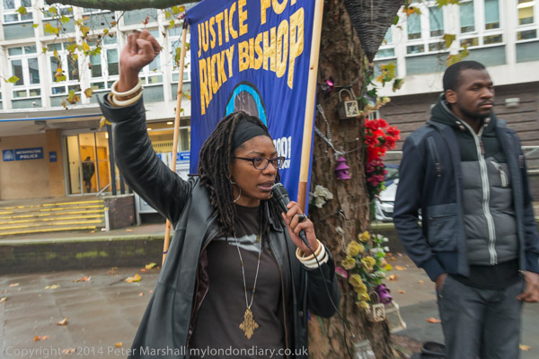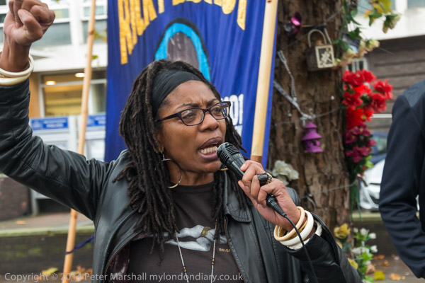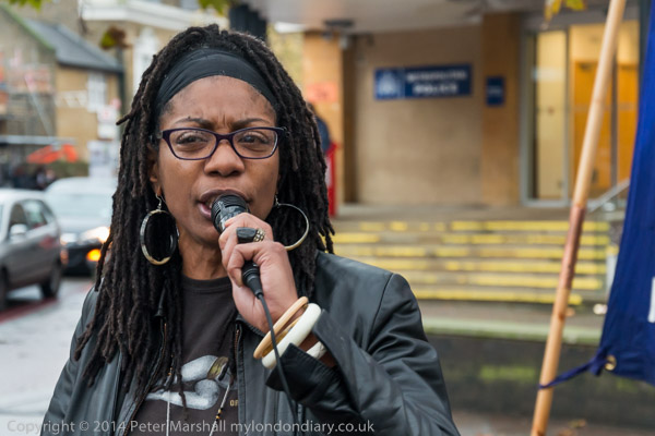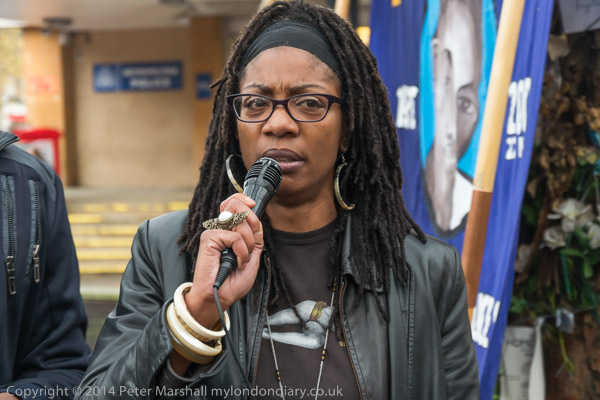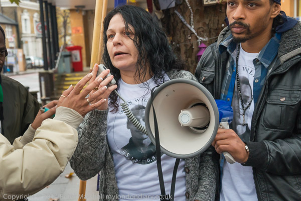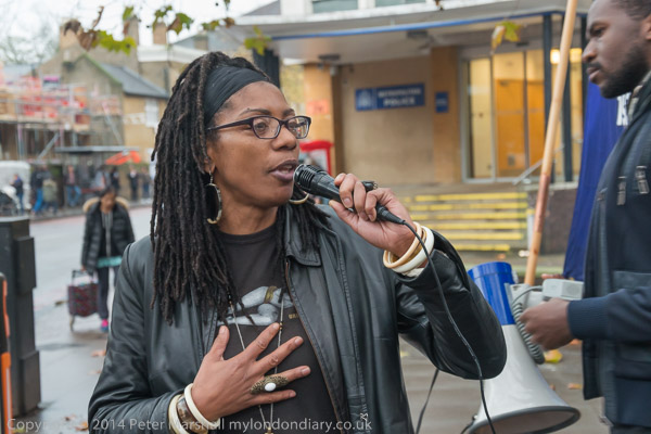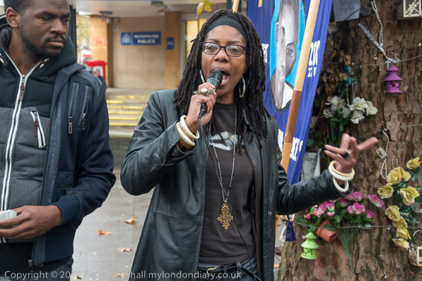 Marcia Rigg's speech is interrupted by shouts from inside the police station, accusing her of lying