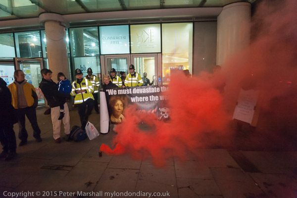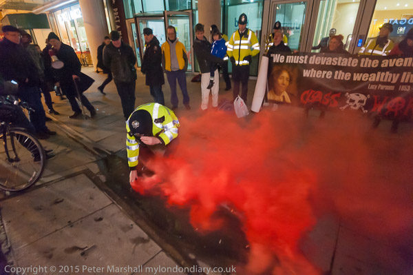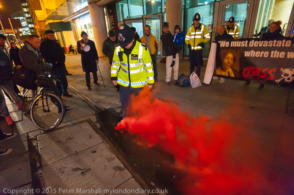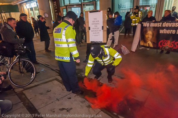 and into a bin on the corner where it continues to burn, now spilling its red smoke into the busy junction