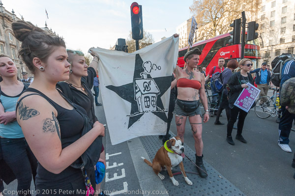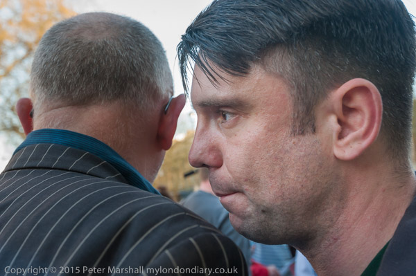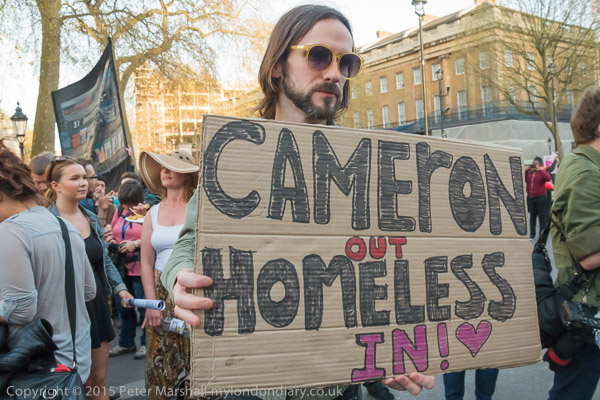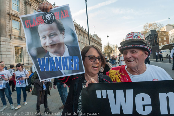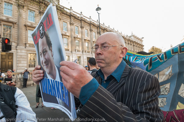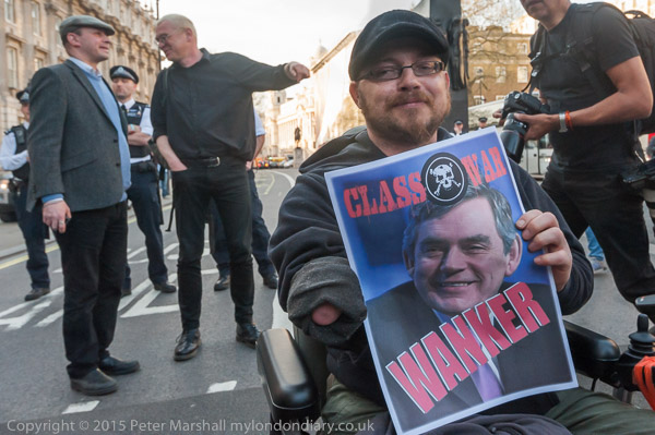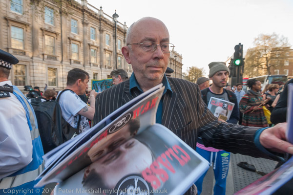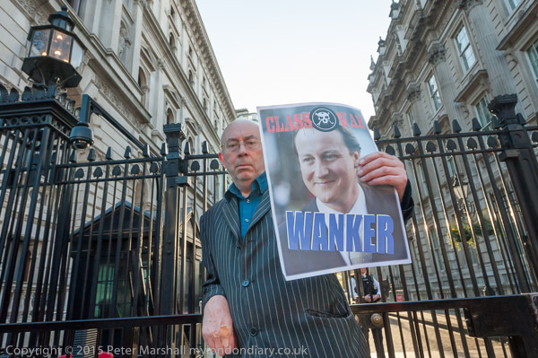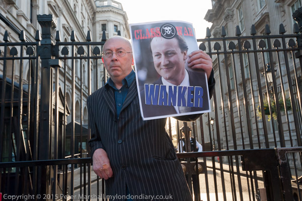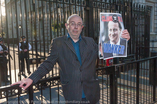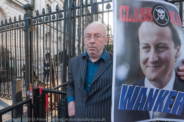 Ian Bone holds up a Class War poster of Cameron at the gates of Downing St