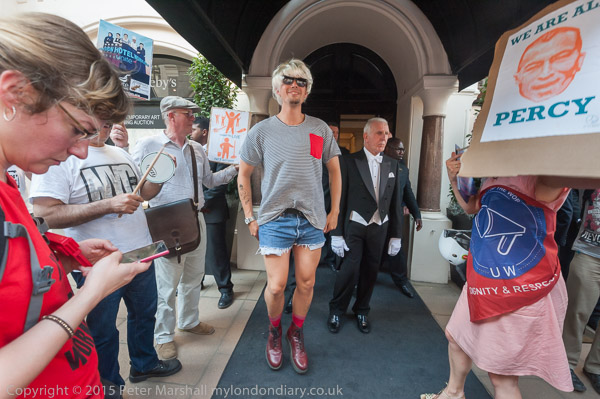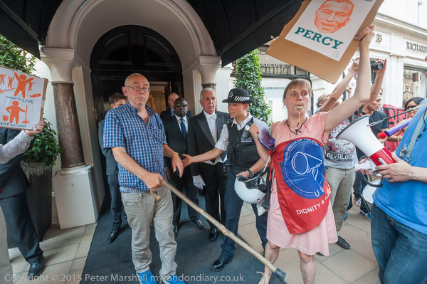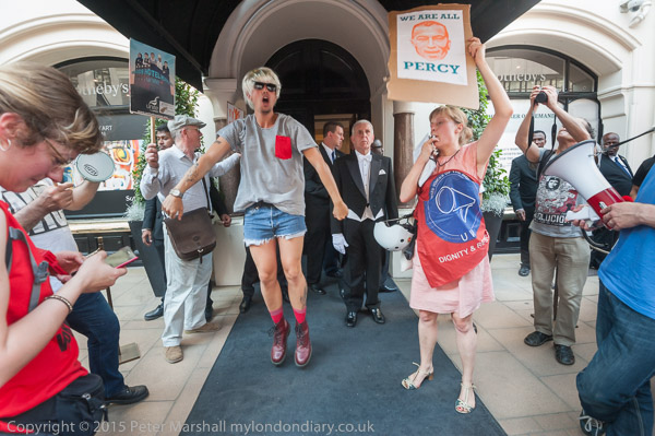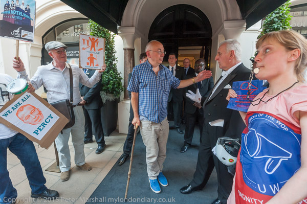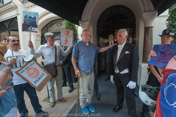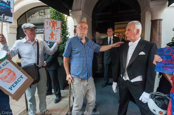 Class War entertain: Ian Bone approaches the doorman to pose with him for photographs
