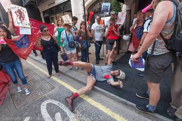 Adam Clifford from Class War dances on Sotheby's carpet which is on the pavement
