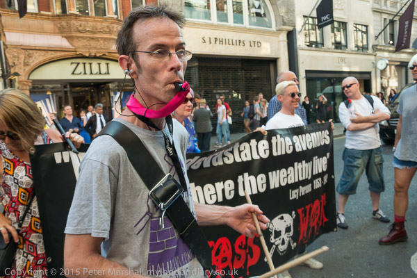 A drummer in a t-shirt from the SOAS campaign against outsourcing