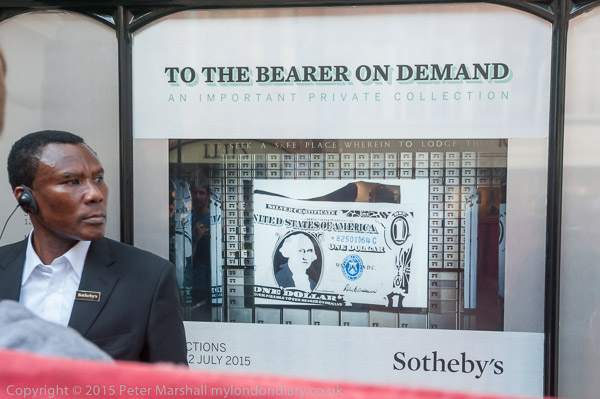 In the Sotheby''s window a picture of a hand painted dollar bill byAndy Warhol which sold at the auction for £20.9 million