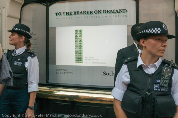 People can still go in and out of Sotheby's but have to walk around the banner