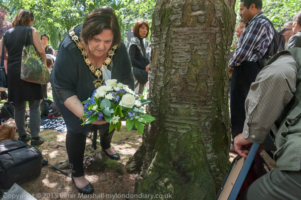 Cllr Larraine Revah, Mayor of Camden lays flowers at the Hiroshima cherry tree