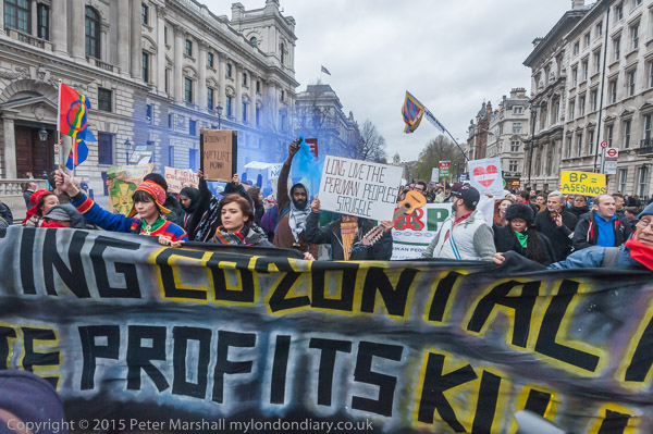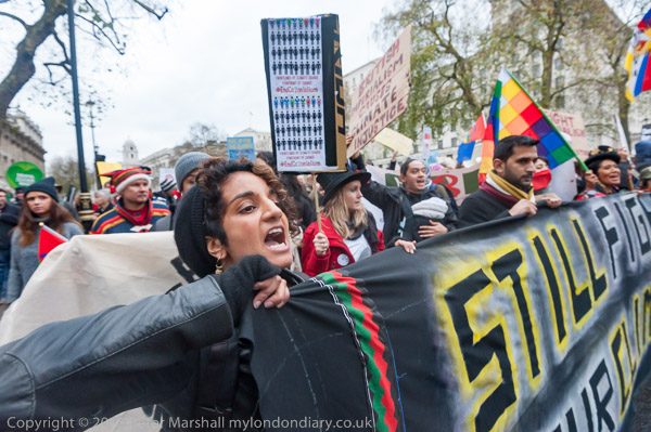 The Global Frontlines bloc paused briefly to protest outside Downing St