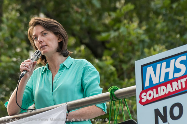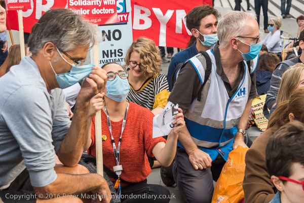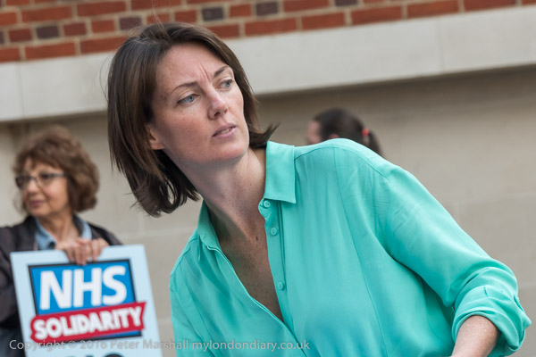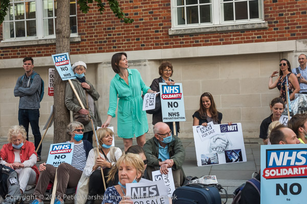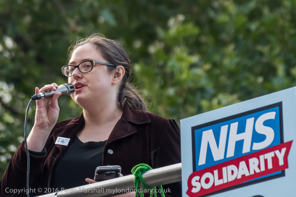 Junior doctor Aislinn Macklin-Doherty hands out posters reading 'NHS for Sale'