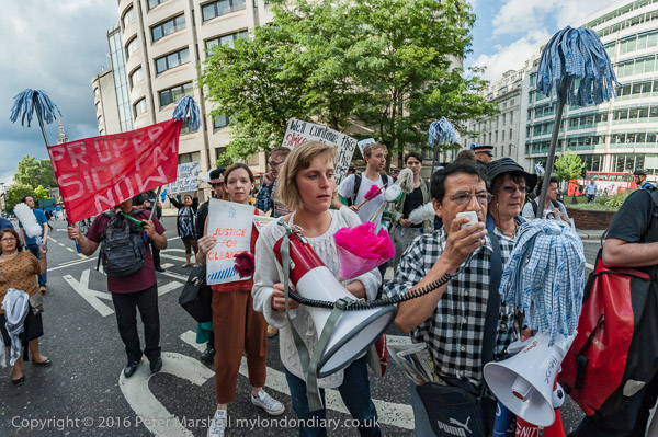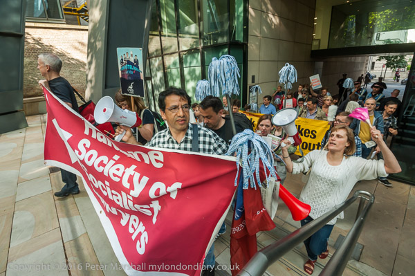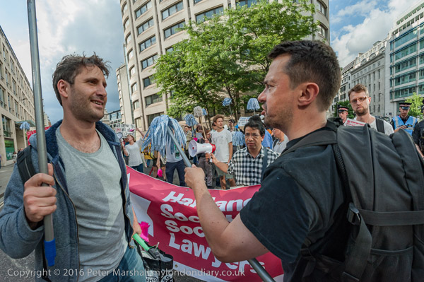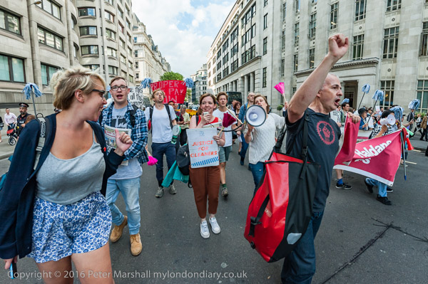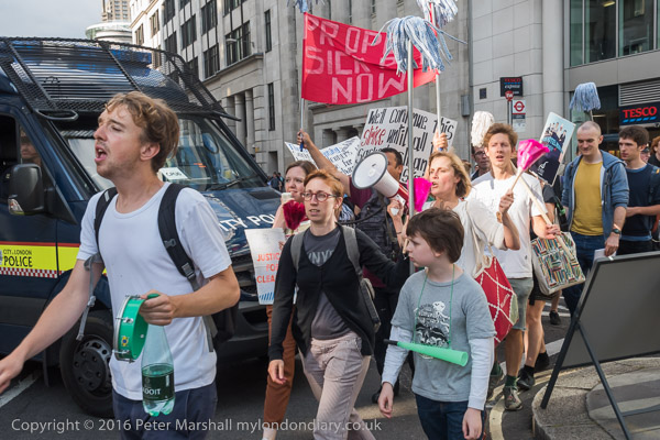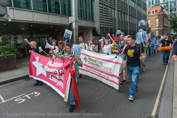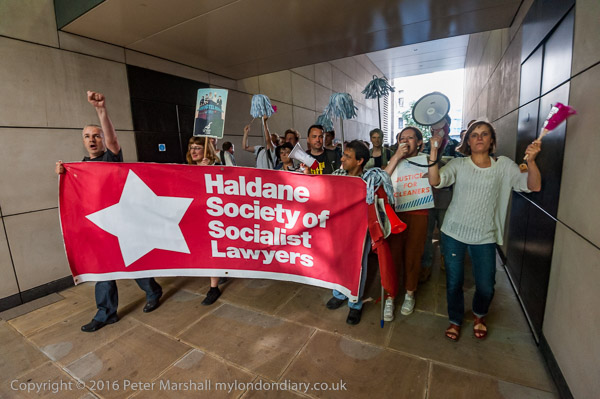 The protesters march around 100 Wood St, lead by the Haldane Society of Socialist Lawyers banner