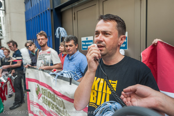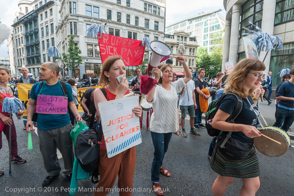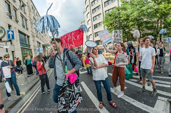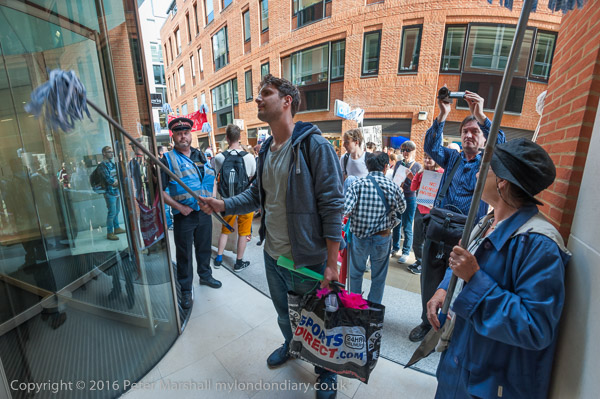 The protest pauses briefly on the road close to the front entrance of the CBRE offices in St Martin's Court