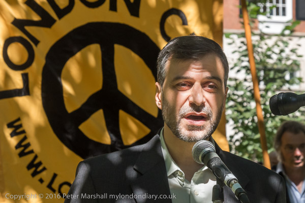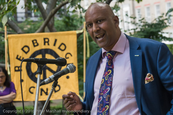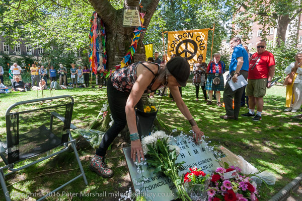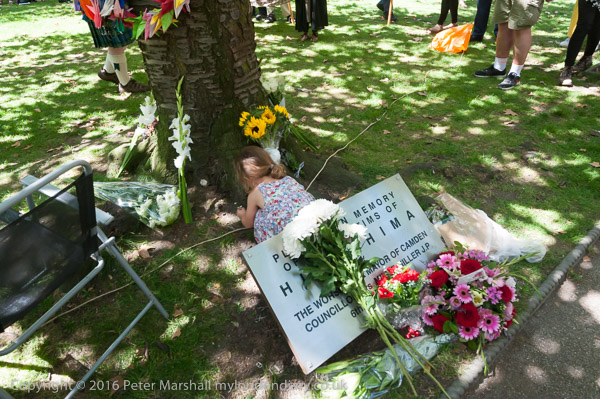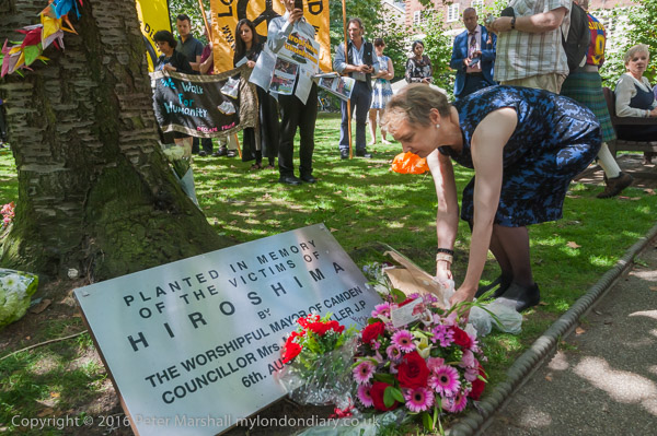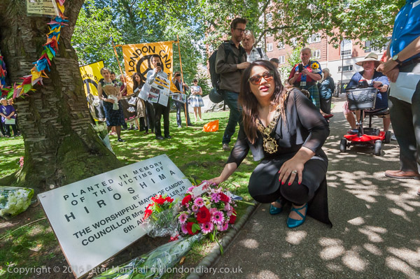 Cllr Nadia Shah, Mayor of Camden, lays a wreath at the commemorative cherry tree