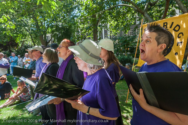 Raised Voices Peace Choir singing 'The H-Bombs Thunder'.