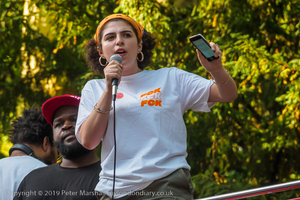 There were several speakers from the top of a bus