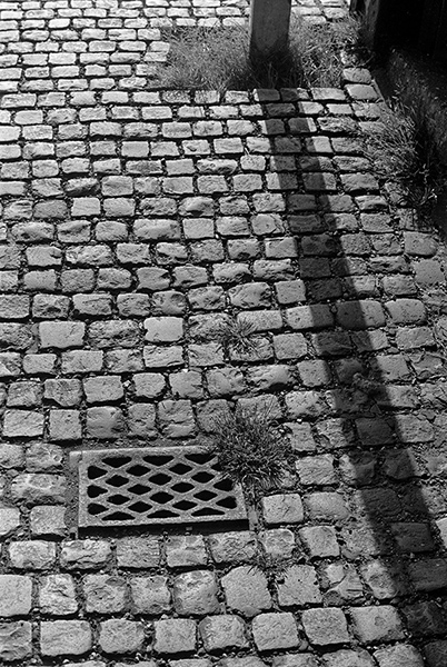 Cobbles by the side of the dock, between it and the sheds around the dock, with a drain and the shadow of a post. Humber Dock was approved by an Act of Parliament in 1802 and completed and opened in 1809. It closed in 1968, re-opening in 1983 as the Hull Marina. The weeds had grown in the nine years after it was closed.