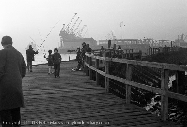 People fish on a foggy day from a pier to the west of Humber Dock Basin with the entrance to Albert Dock with its swing bridge in the right background, and two rows of dockside cranes.
