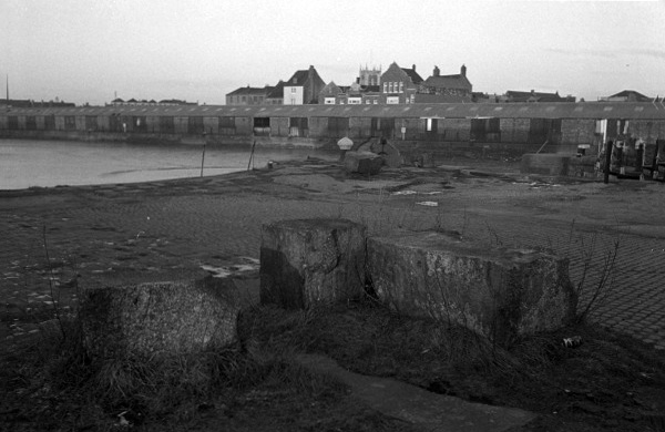 This view of Humber Dock is from close to the entrance lock, and the upper storeys of the row of buildings on Humber Dock St can be seen clearly above the dockside sheds, with the tower of Holy Trinity showing in the middle of them. The dock - now the Hull Marina - is clearly full of mud, and the area around the entrance lock (where a bollard is clearly visible) looks rather a mess. The next image shows a clearer view from almost the same position.