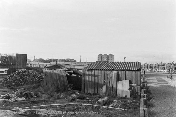 The remaining warehouses of Railway Dock appear over the roof of a rather basic shed in the centre of the picture, part of which has collapsed and at left are the ends of a couple of lorries parked in this area to the west of Humber Dock Basin, which I think was part of Island Wharf.