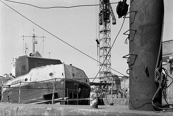The ship was around 50.3m long and 10.4 m wide, reasonable fit in the dock which was 65.2 by 14.8 m according to https://en.wikipedia.org/wiki/Port_of_Hull Wikipedia. The dock, built in the first half of the nineteeth century was at the time of the photograph I think owned by Mersey Welding; it is still present, but was completely silted up. The shed at left and a brick building just out of this frame to the left are still there, with a sign in front for Blenco Welding Ltd on the pipe at the right of my picture. I think that company is no longer in business.