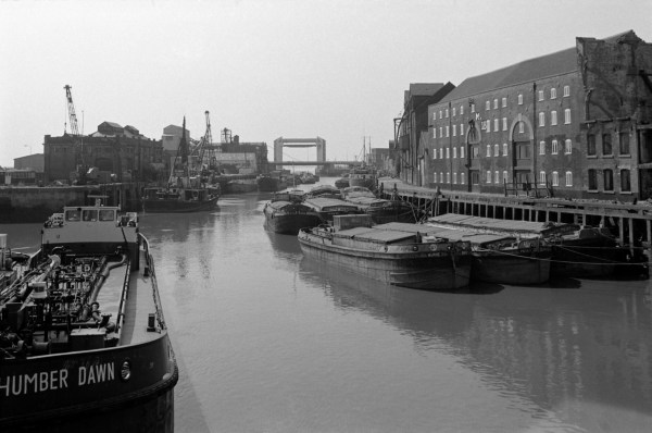 The view shows in the distance the new Myton Bridge which opened in 1981, with just a single car visible on it (too small to see on the web image), and a fairly usual mix of barges and other vessels moored on both banks of the river. At right are the Grade II listed Pease Warehouses, with the fire damage at the extreme right having reduced the right-hand block from five to two storeys.