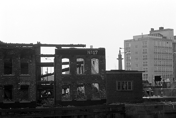 This was a five storey warehouse at the north end of the Pease Warehouses that had been largely destroyed by fire. It was about to be rebuilt and, along with the rest of the warehouses turned into flats in 1981. The warehouses date from around 1750 and were Grade II listed in 1952.