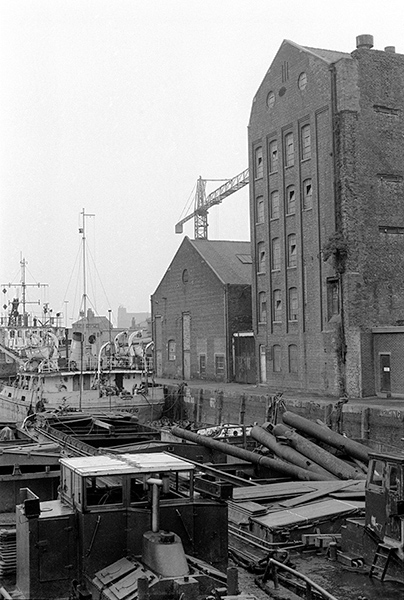 The view of the east bank of the River Hull looking upstream from Drypool Bridge with a number of boats in various states of disrepair moored. The largest is the Kenfig, a grab hopper dredger built in 1954 (possibly by Richard Dunston at Hessle) for Port Talbot and renamed Hedon Sand in 1984. It was one of the dredgers used to clear the passage into Humber Dock for the Marina, and was later scrapped at New Holland. Kenfig is a Welsh village near Bridgend on the Bristol Channel notorious for the number of wrecks around it, on the Scarweather and Nash sands, Tuskar rock and Sker point.