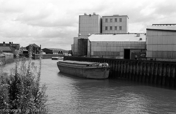 A little downstream from the Hull Exhaust Centre, visible at left was another viewpoint, I think from a derelict wharf on the River Hull. This image, looking upstream, shows barge Torch, with number 22, owned by Hull's Gillyott and Scott, a major tug and lighter owner formed in 1964 by amalgamation of the five companies of William Gilyott, John A. Scott, T.F. Wood, Furleys and John Deheer. Gilyott and Scott (Transport) Ltd also owned lorries. The barges are said to have been sold to Dave Hornshaw of Hornshaw Water Transport in Goole.