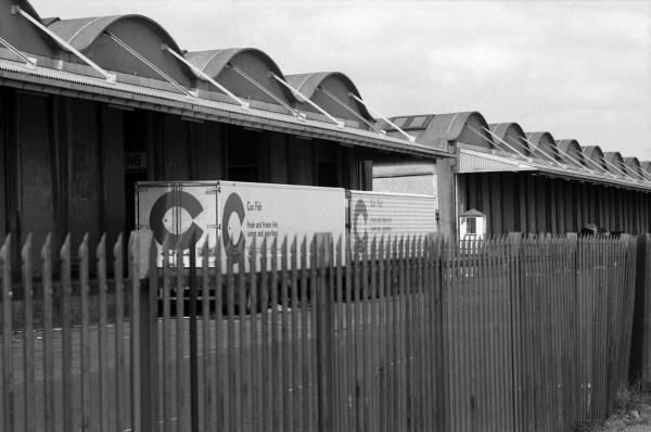 27k45: Dockside sheds from footpath by Humber, Albert Dock, 1981 - Docks