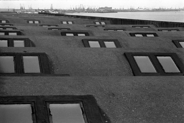 27o16: View from rooftop path at Albert Dock east to King George V Dock, 1981 - Docks