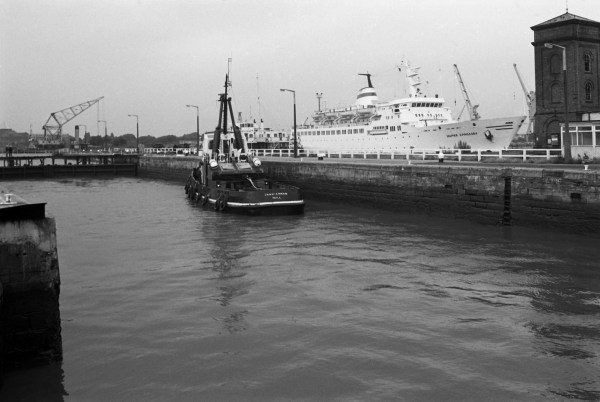 Another view of the entrance lock to Alexandra Dock, with the Hull tug Trawlerman moored in it, taken from the public footpath which crossed the lock gate here. In an arm of the dock to its right is the ship MAPÈß EPMOAOBA - the Maria Yermolova, a Russian cruise liner built for the Murmansk Shipping Company in 1974 at the Kraljevica shipyard named after Marshall Tito who worked there before the war. It was the first of eight similar ships built there under an order made by Leonid Brezhnev after a brotherly plea from Tito to save the shipyard. They were luxury ships for 206 cruise passengers with air conditioning in all cabins.