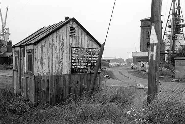 A shed next to the footpath across Alexandra Dock entrance carries a notice from the British Transport Docks Board warning persons using the public right of way in Alexandra Dock that trespassers on the dock estate will be prosecuted. The notice, probably long gone, is no longer needed as the footpath in the dock was closed in 2012 for the convenience of Siemens and their wind turbine building facility here.