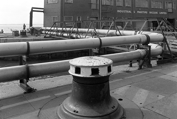 32t53: St Andrew's Dock entrance, the Bullnose and pipes, 1982 - Docks