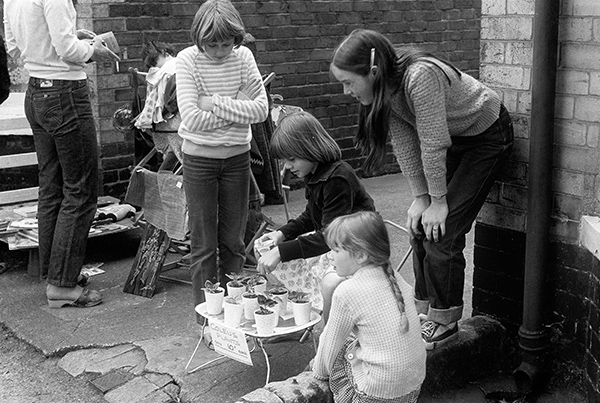 28o11: Childrens sale on street, 1981 - Springbank
