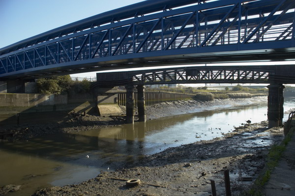 Underneath East India Dock Road bridge over the River Lea (Bow Creek)