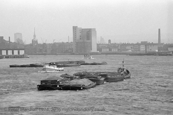 3k-42: Tower Hamlets, Southwark, river, lighters, tug, mill, church, flats,