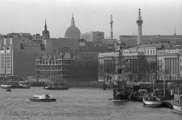 The City from Tower Bridge, 1974 3k-44: City, river, boat, office, church, Monument, pre-Victorian,